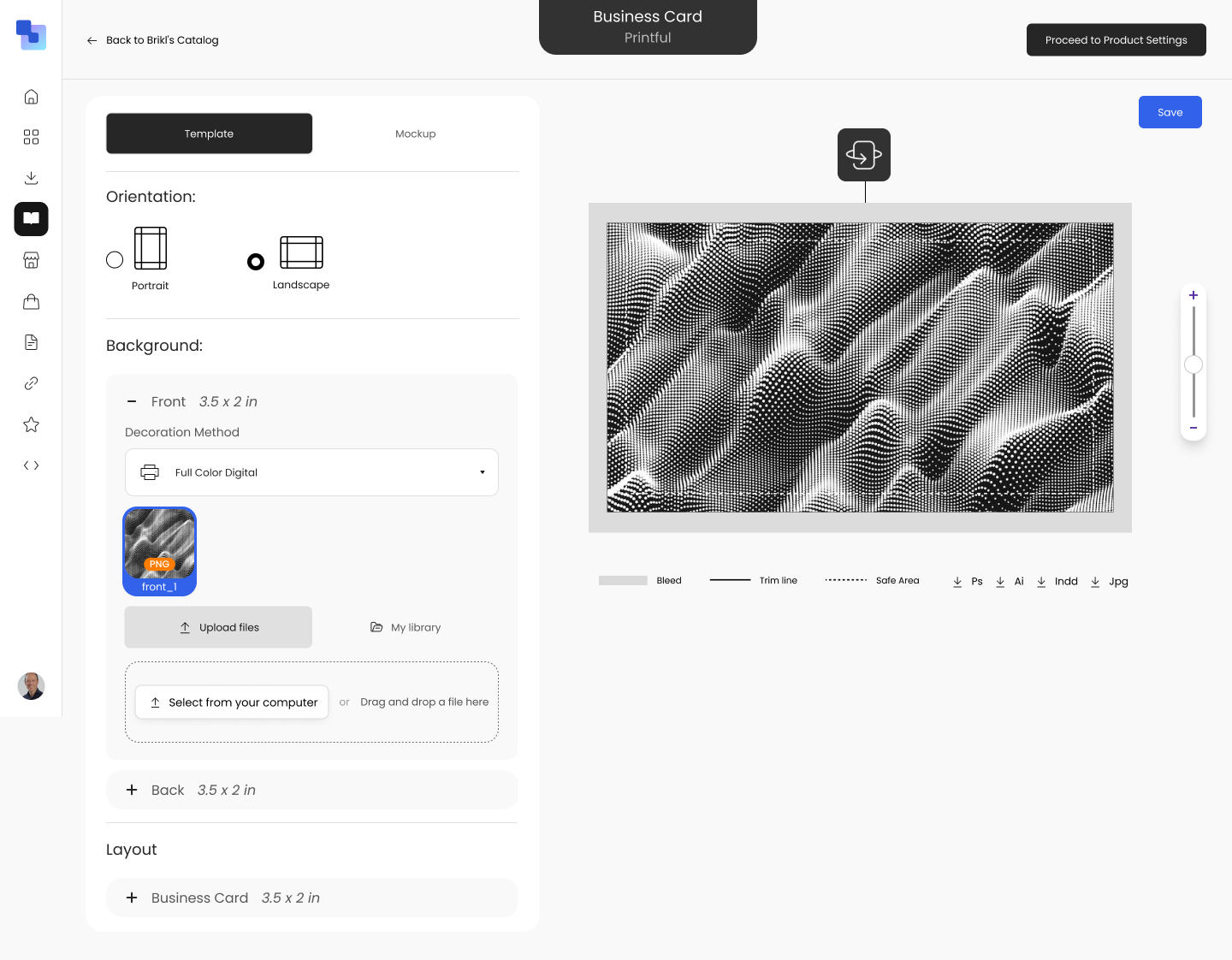 The template editor shows bleed, trim lines, and safe areas. Artwork downloads are available in Ps, Ai, InDesign, and JPG formats. What you design is what gets printed.